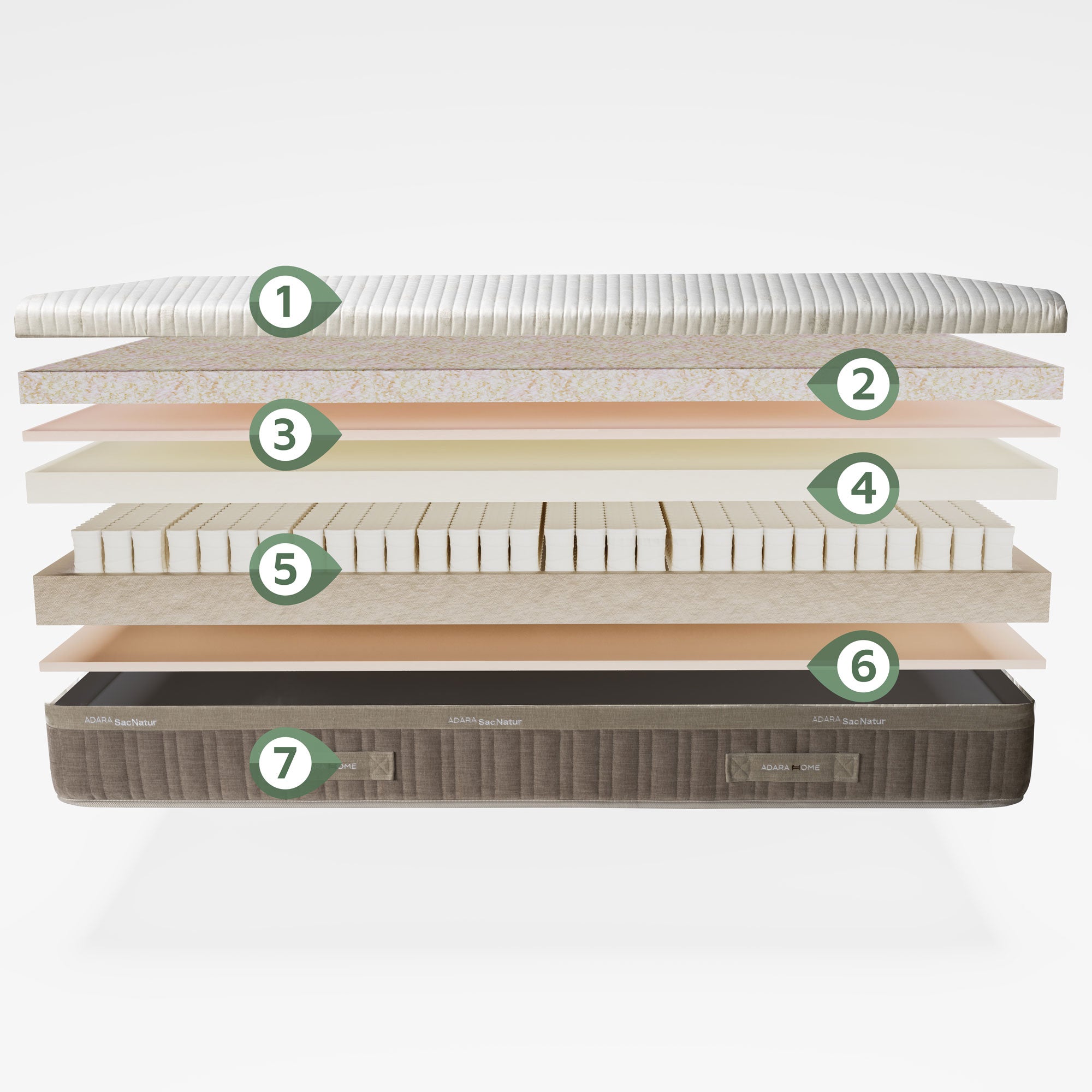 Pour ceux d'entre vous qui comparent les modèles de matelas, vous vous demandez peut-être : quelle est la différence entre le matelas Adara Sac Natur et le matelas Adara Naturline ? La seule différence est le noyau. Le Adara Naturline est en mousse, tandis que le Adara Sac Natur a un noyau de ressorts ensachés. Cette petite mais grande différence fait que le modèle Adara Sac Natur est de fermeté moyenne à élevée et d'une douceur exquise, offrant un accueil chaleureux au dormeur sans sacrifier l'indépendance des côtés du lit et un soutien approprié.